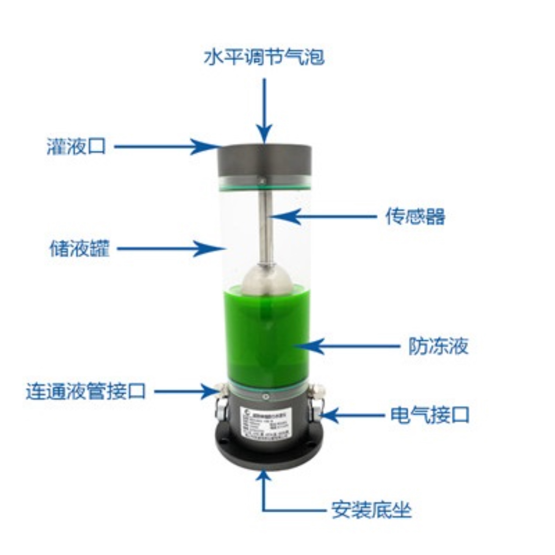 磁致伸縮式靜力水準儀是由一個高精度的磁致伸縮液位計,加上儲液罐、液位浮子、保護罩、調平支架、聯通氣管、水管等部件組成。